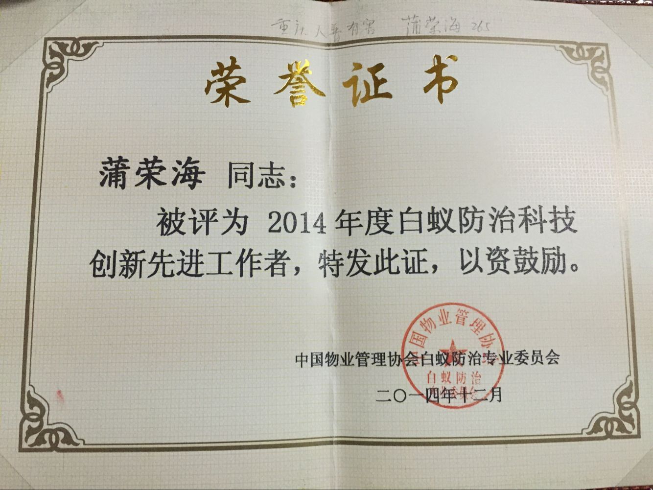 熱烈祝賀本公司蒲榮海榮獲2014年度白蟻防治創(chuàng)新優(yōu)秀工作者